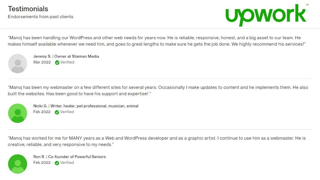 “Quality work. Manoj always responds to my requests quickly and gets the job done. He is reliable and efficient. He’s my right-hand man. “